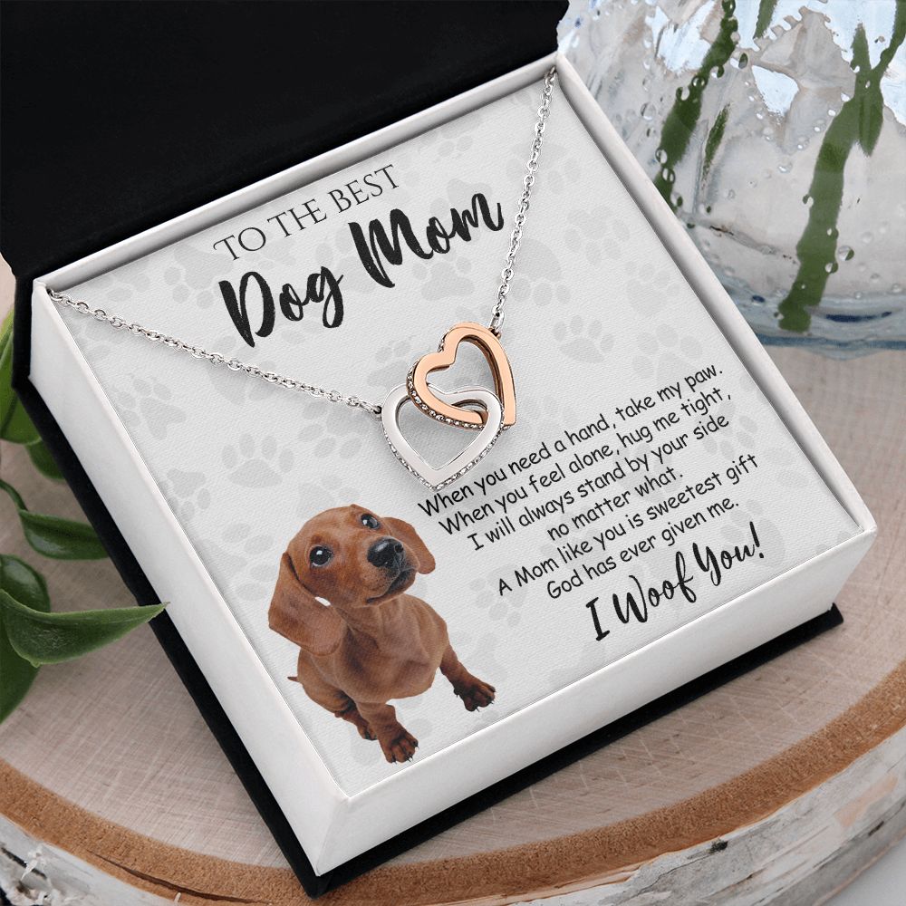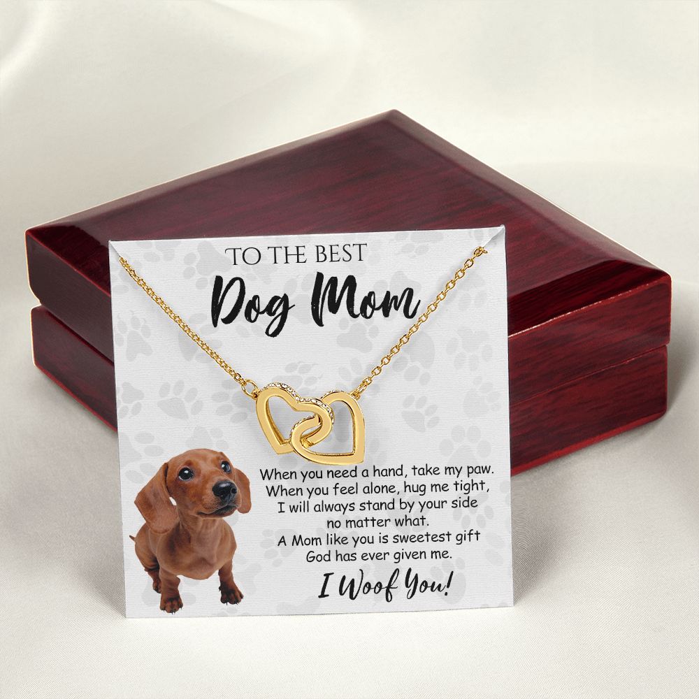To The Best Dachshund Dog Mom Knot Necklace Mother's Day Gift , I Woof You Quote Gift Card, Message Card Jewelry For Dog Lovers, Necklace For Mom Interlocking Hearts Necklace