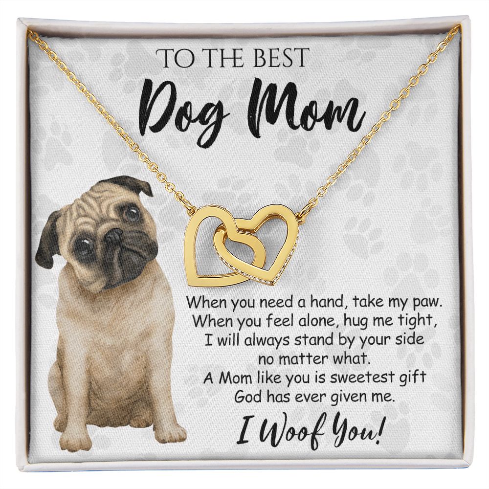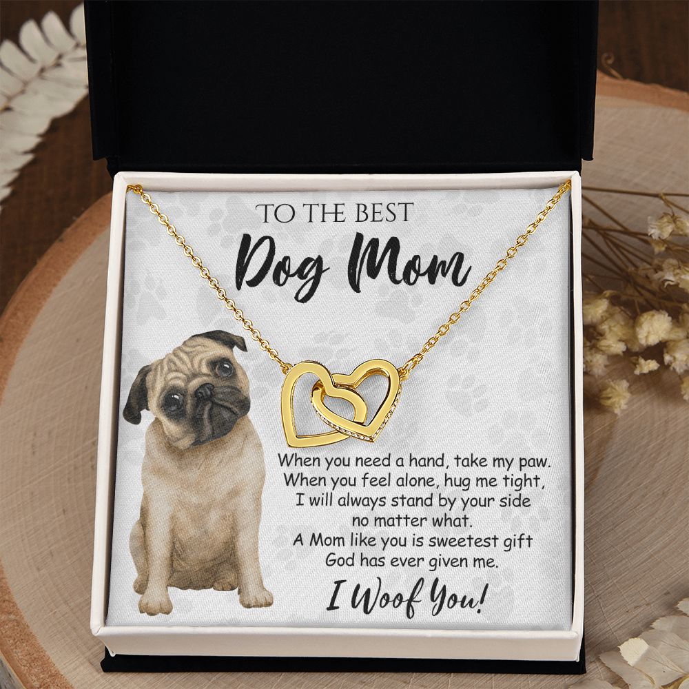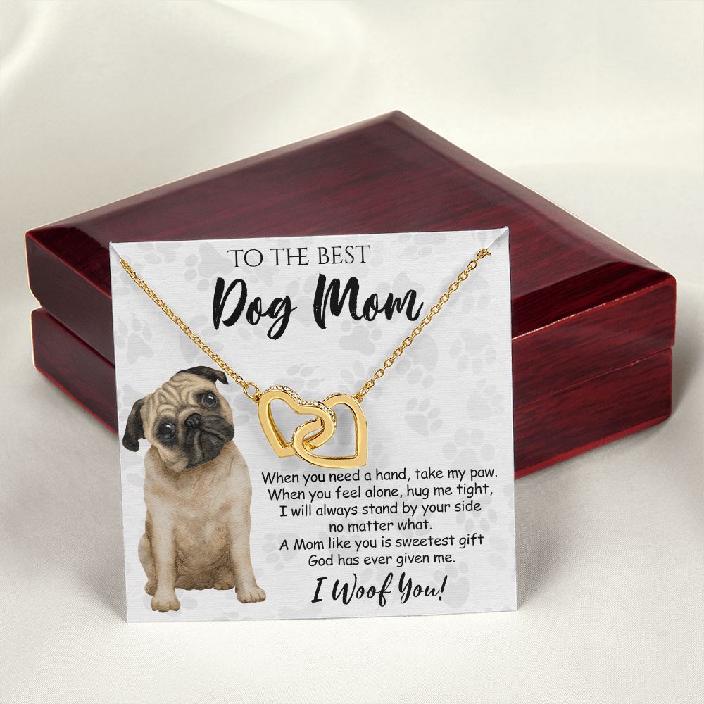 To The Best Pug Dog Mom Knot Necklace Mother's Day Gift , I Woof You Quote Gift Card, Message Card Jewelry For Dog Lovers, Necklace For Mom Interlocking Hearts Necklace