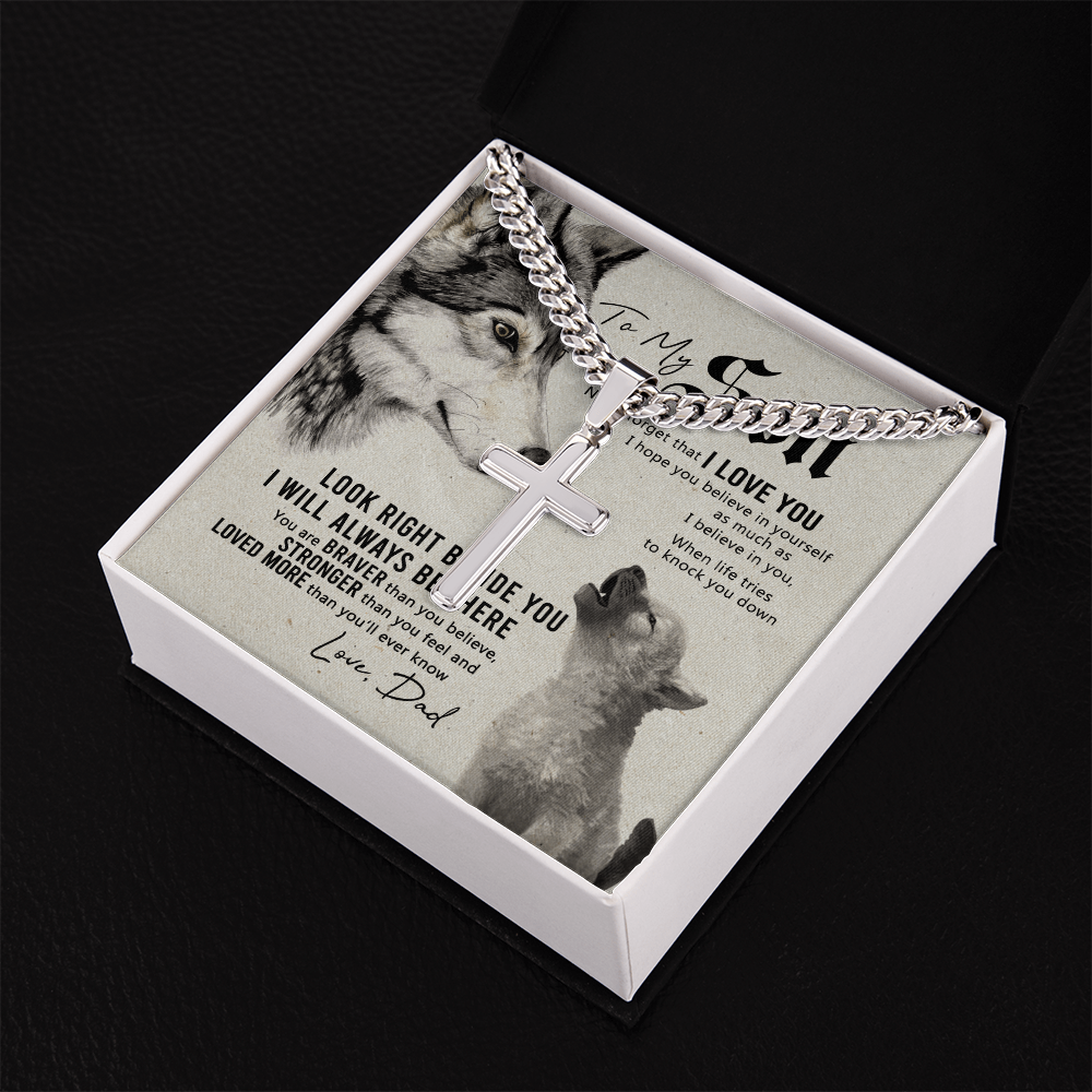 Wolf Father To Son Engraved Cross Necklace Gift For Son, To My Son Engraved Cross Necklace From Dad, Dady Meaningful Jewelry Gift For Men Artisan Engraved Cross Necklace Gift For Wolf Son Necklace
