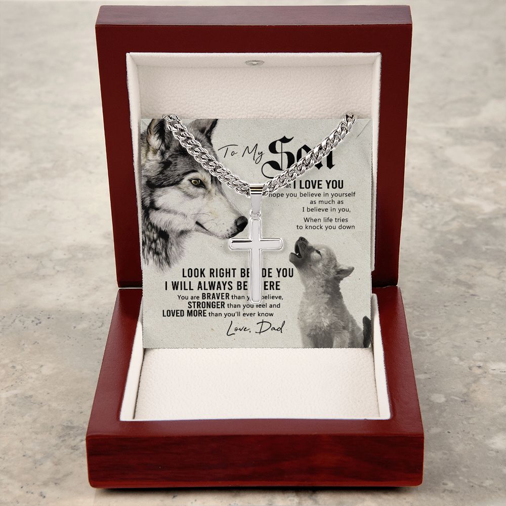 Wolf Father To Son Engraved Cross Necklace Gift For Son, To My Son Engraved Cross Necklace From Dad, Dady Meaningful Jewelry Gift For Men Artisan Engraved Cross Necklace Gift For Wolf Son Necklace Cuban Chain with Artisan Cross Necklace